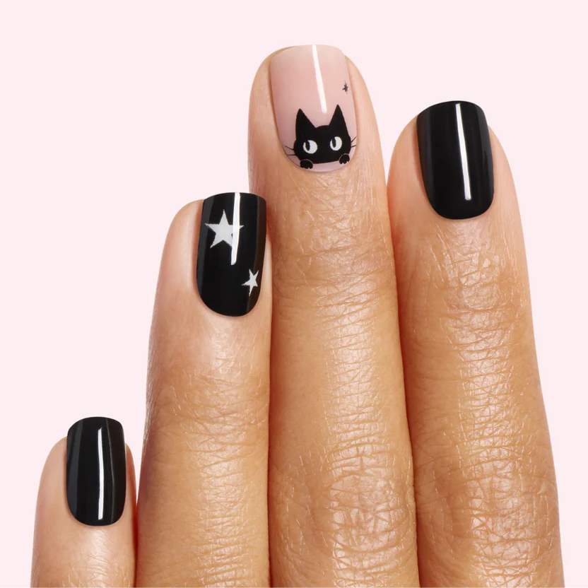 And I like what I heard. š š¼ Black & light nude gel nail strips featuring moons, stars, and black cats with a glossy, high-shine finish.