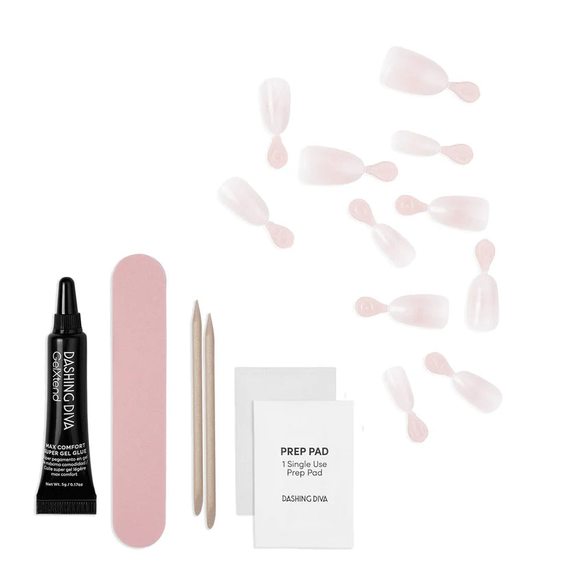 30 nails, 1 max comfort soft gel glue (5g), 1 mini dual-sided file and buffer, 1 prep pad